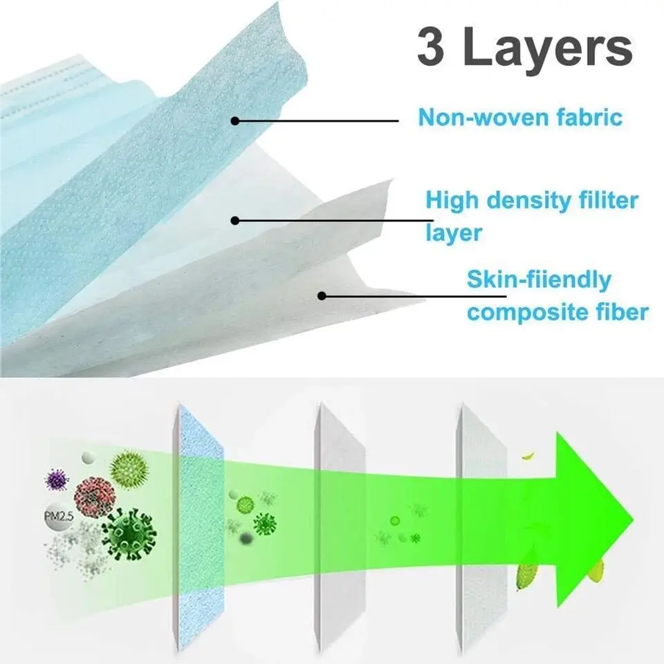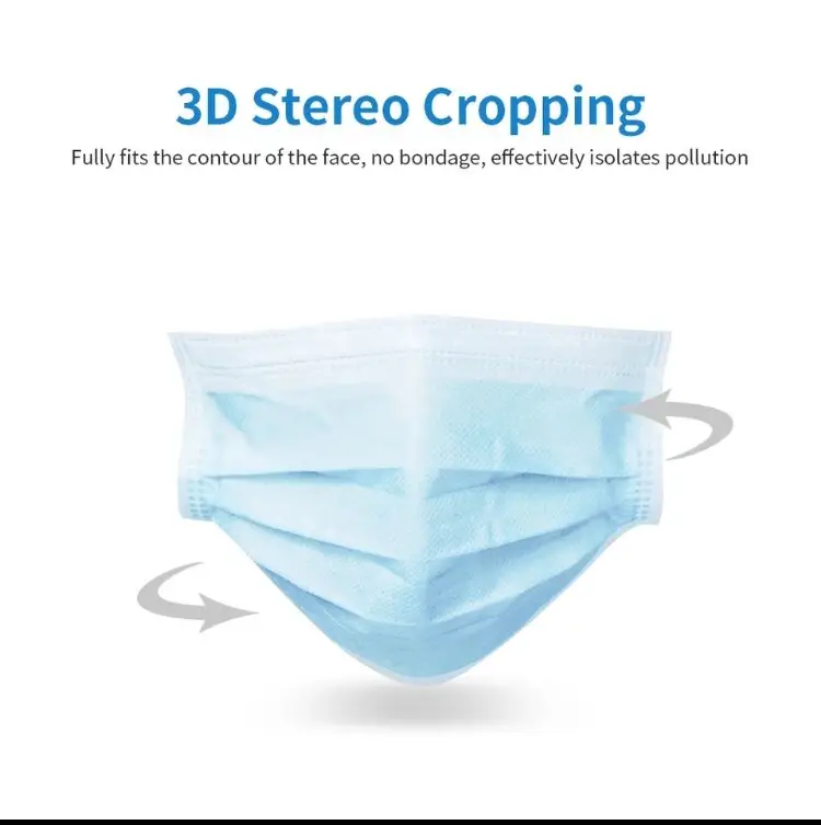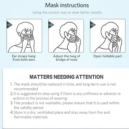 1. 100% brand new and high quality. 2. Disposable quality face mouth mask, made of 3 ply material. The outer material is Waterproof non-woven fabric which can effectively prevent dust and droplets, the middle layer material is melt-blown material which can effectively filter, the inner material is soft non-woven fabric which can absorb the moisture of body's expiration to keep our skin dry. 3. The aluminum strip on the bridge of the nose can be adjustable to fit your face. The elastic ear loop is easy to wear and no pressure to the ears. 4. Comfortable and breathable design can prevent automobile exhaust, pollen, odor, allergies, contaminants, bacteria etc. Chinese tips for staying healthy: