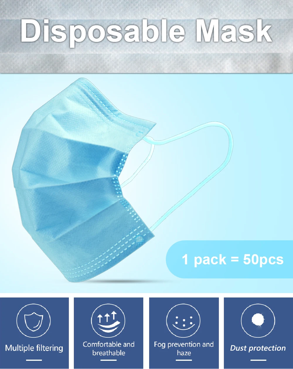 50pcs/Lot 3-Layers Mouth Mask Face Masks Disposable Filter Safety Mask Earloop Face MasksBuy Now On Aliexpress
