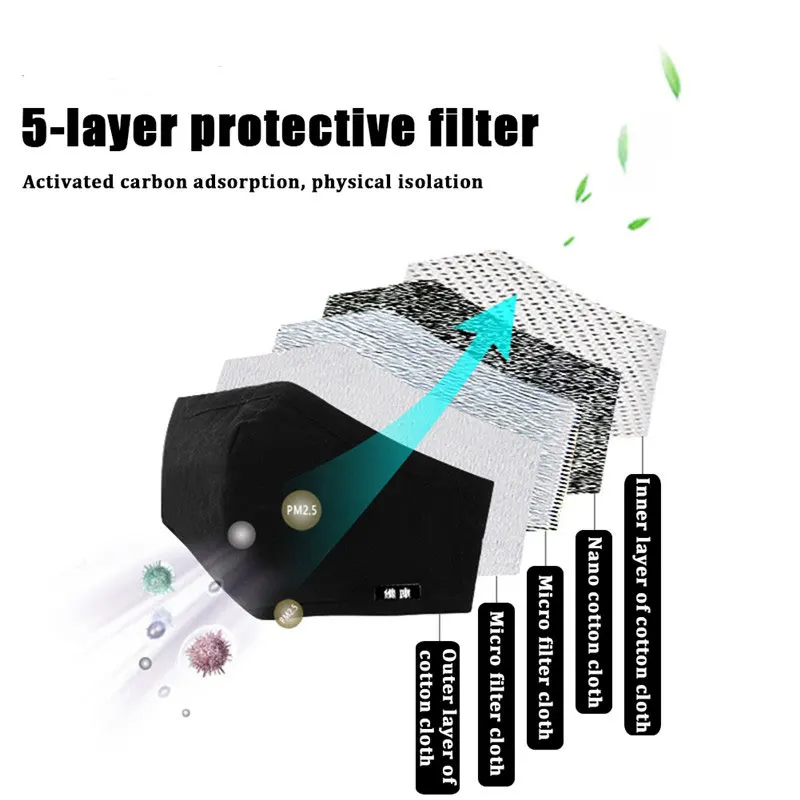 1. Military grade filtration, comes with adjustable ear strap and nose bridge, ergonomic, built-in one way exhalation valve can automatically opens and closes, so as to breathe smoothly, glasses don't fog up. 2.100% brand new dustproof mouth mask with filter, ultra-soft, ecofriendly, comfortable, simple, lightweight, reusable. 3. 4 layers PM2.5 activated carbon filter insert and valve system protection can filter almost 100% of particulate matter, gases, odors, dust, pollen, smog, PM2.5, germs, bacteria and viruses ect. 4.Easy to clean, mouth mask can hand wash, hang it dry, filter can be replaced, mask can last up to a year. 5.Suitable for running, cycling, hiking, skiing, crafts, gardening, anonymity and other outdoor activities, such as travelling, hospital, public places. 6.Ideal for kids, older, pregnant women, women, men, teens etc.Feature