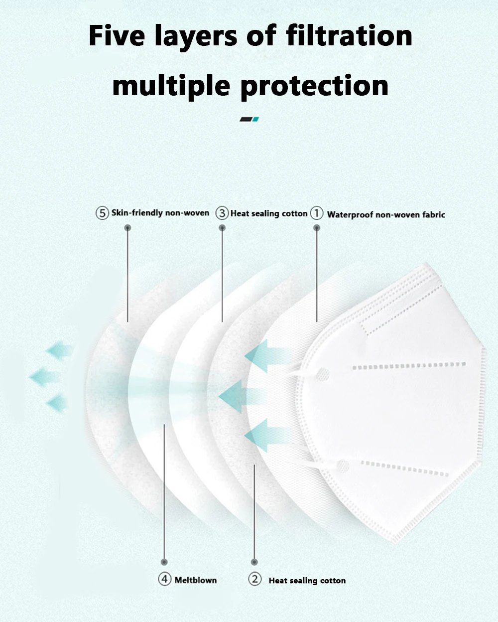 Material: non-woven/Melt blown fabric/Skin friendly non-woven fabricType: 3-Layer Dust maskMask style: hanging earColor:Light BluePacking: 10/20/30/40/50/100/200 pcsFilter effect: protection level1. Made of environmental Breathable friendly material, moisture-proof, non-toxic, non-irritating, soft and comfortable.2. Special 3 ply non-woven design, provides protections against dust, automobile exhaust, pollen, etc.3. Perfect design, when you wear it , it fits seamlessly into your face. Elastic ear loop is easy to wear and no pressure to the ears.5.Soft texture and comfortable wear. can filter toxic particles and is waterproof