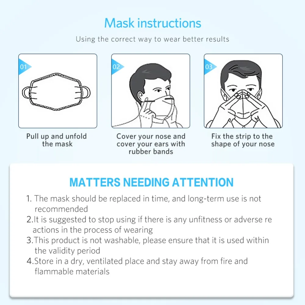 ◆ About KN95 Masks1. The filtration efficiency of particulate matter can reach 95% under standard conditions. 2. Can isolate smaller particles,fit tighter to the face, it's not easy to leak air from the periphery. ◆ Package included:Package included:1pcs / 5pcs / 10pcs / 20pcs ( Please choose the quantity correctly when order ) Please be kindly noted,the listed product is produced and distributed abroad and subject to the laws of its country of origin.
