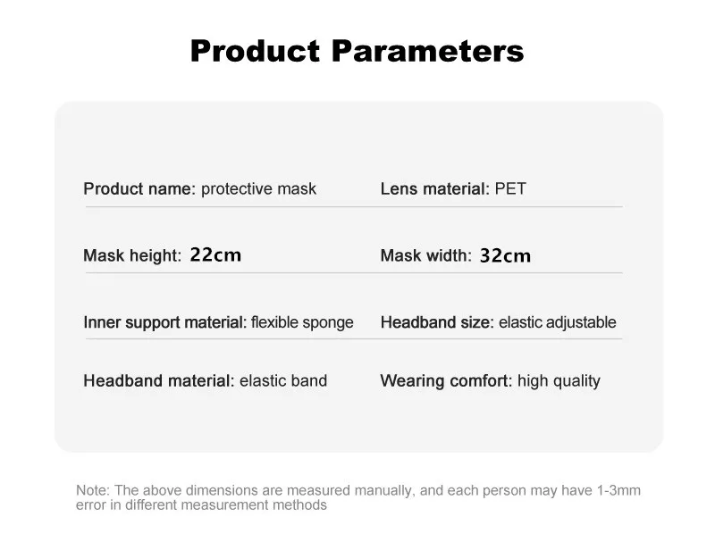 Description:1.Item Name: Head-mounted Transparent Protect Mask(Not adjustable full face mask)2.Material: PET3.Style: Head-mounted4.Weight: 37g5.Size:32 * 22CM6.Scope of application: anti-fog, saliva protection, covering face7.Features: Windproof, Dust-proof, Anti-droplet, Face ShieldFeatures:1.100% brand new material2.Lightweight and fast, easy to operate3.Wide coverage and safety protection4.Transparent lens PET material,do manual work is delicate, prevent all kinds of Lampblack splash, protect the face.5.Suitable for home, travel, , laboratory and other places.Notes:1.The broadband of this mask is not adjustable, but it is suitable for most people.Please understand that.2.Because this product is manually measured size and weight, there will be certain errors. Please understand that.3. The real color of the item may be slightly different from the pictures shown on website caused by many factors such as brightness of your monitor and light brightness when photo taking.Thank you for your understanding!How To Uses:1. Just gently peel off the protective film on the outside of the product.2. Wear a mask to position your head.3. As long as the above two steps can enjoy the protection function of this product, you don't need to do any more operations.