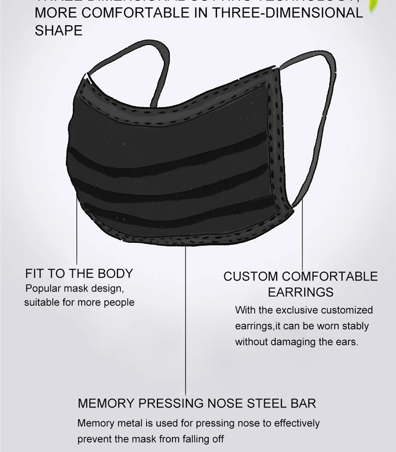1. Made of environmental friendly material, moisture-proof, non-toxic, non-irritating, soft and comfortable.2. Breathable material and cute patterns, which makes it useful and fashionable.3. Special 3 ply non-woven design, provides protections against dust, automobile exhaust, pollen, etc.4. Perfect design, when you wear it , it fits seamlessly into your face. Elastic ear loop is easy to wear and no pressure to the ears.5. Perfect for medical, nail salon or any other areas where protection might be required, such as hospital, airplane, etc.Please be kindly noted: