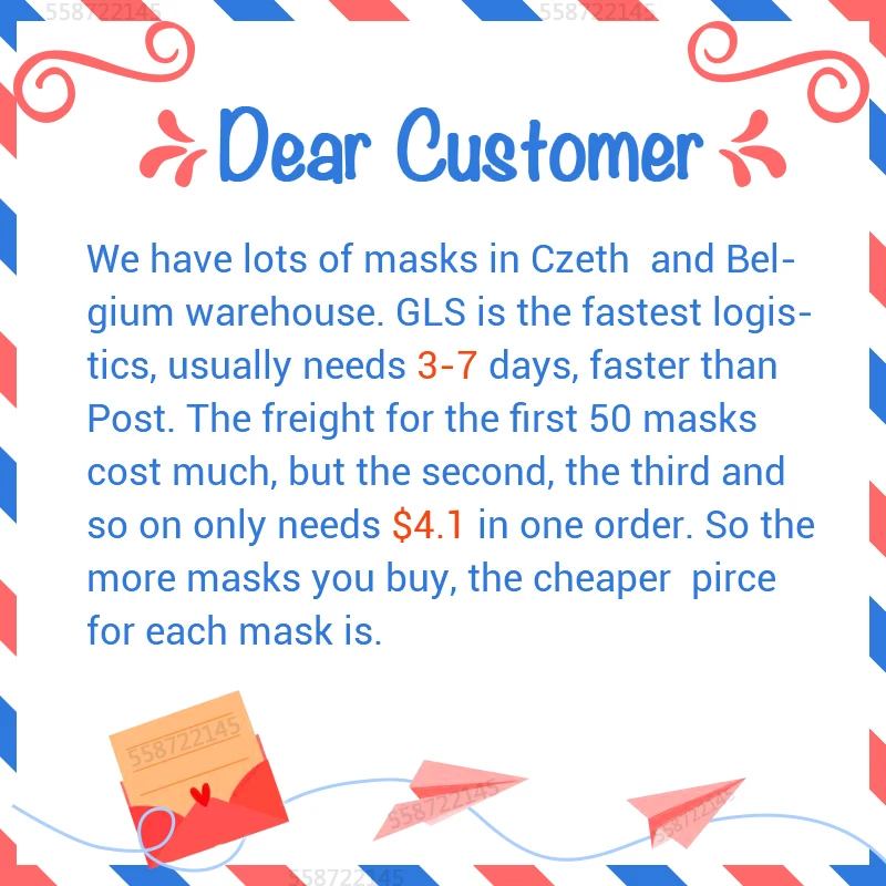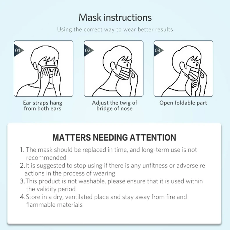 Please be kindly noted,the listed product is produced and distributed abroad and subject to the laws of its country of origin.Description: This item includes 1~100Pcs / pack disposable masks, is made of 3 ply non-woven material.Features: 1. Made of environmental friendly material, moisture-proof, non-toxic, non-irritating, soft and comfortable. 2. Special 3 ply non-woven design, provides against automobile exhaust, pollen, etc. 3. Perfect design, when you wear it , it fits seamlessly into your face. Elastic ear loop is easy to wear and no pressure to the ears.4. Perfect for nail salon or any other areas where might be required, such as airplane, etc. Specification: Condition: 100% brand new Material: Non-woven Fabrics Color: Blue Package Weight: Approx. 35g Size: Approx. 17.5 * 9cm / 6.9 * 3.5inch Earloop Lenght: 13cm / 5.1 inchEarloop Elasticity: Slightly Masks Please allow 1-3cm error due to manual measurement. Thanks for your understanding.