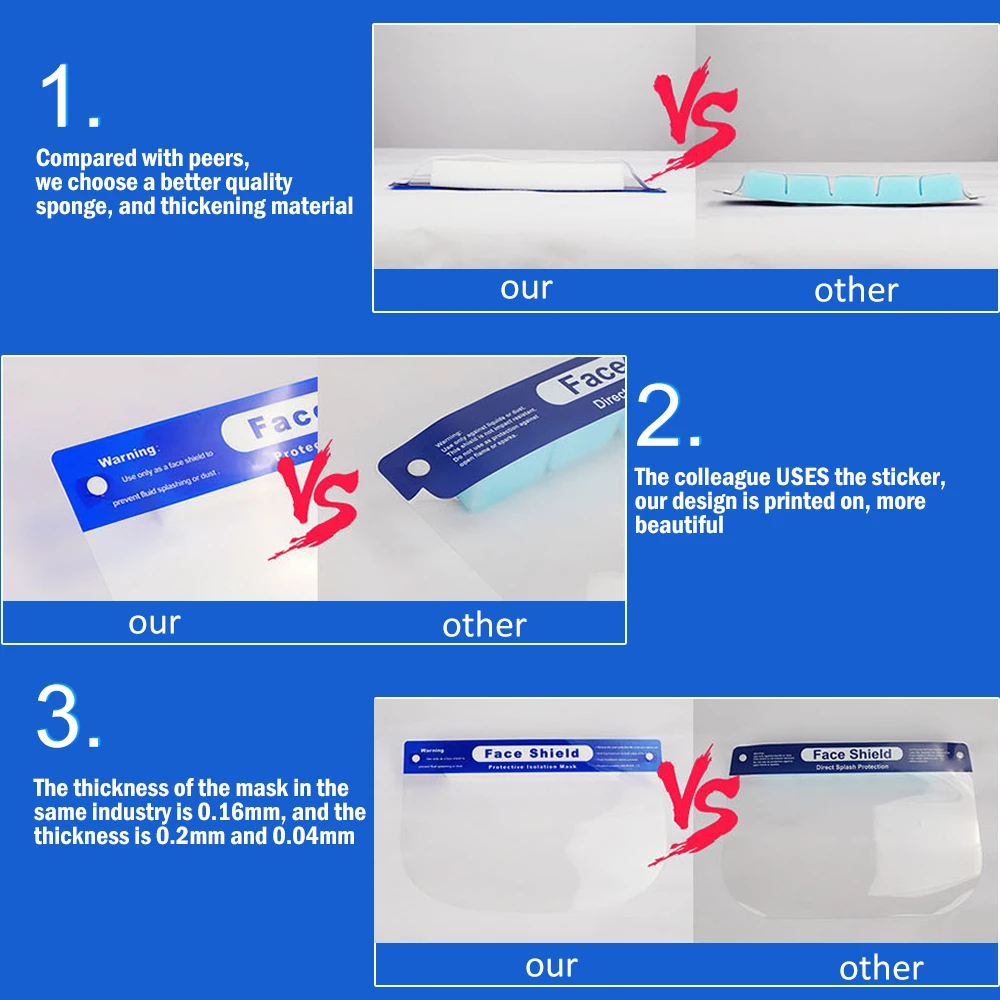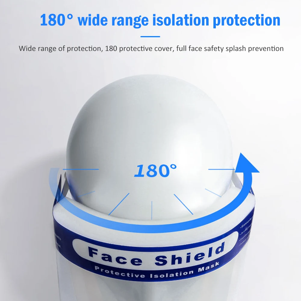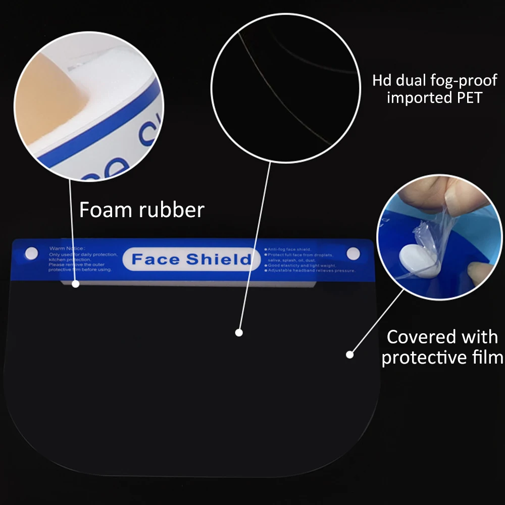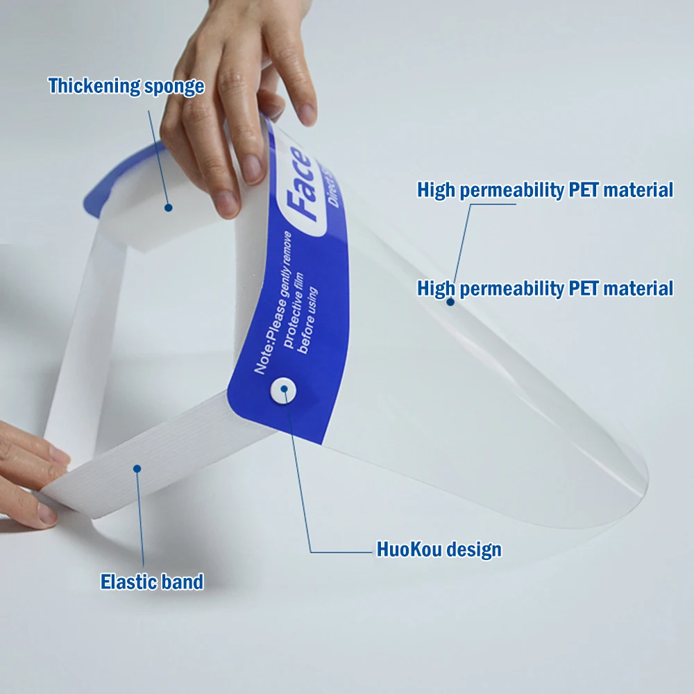 This face mask with eye shield can be recycled after disinfection.The plastic face shields is made of super transparent recyclable PET, lightweight, clear vision, fast and easy to wearThis reusable face shields a large area from the eyebrows to the chin to protect against foreign aggression on your faceThis full face shield increases the area to protect a large area from the eyebrows to the chin to protect against foreign aggression on your face.The plastic face shield has a foam strip, and the elastic band can be easily adjusted to suit habits, and it is firmly fixed and comfortable to wear.